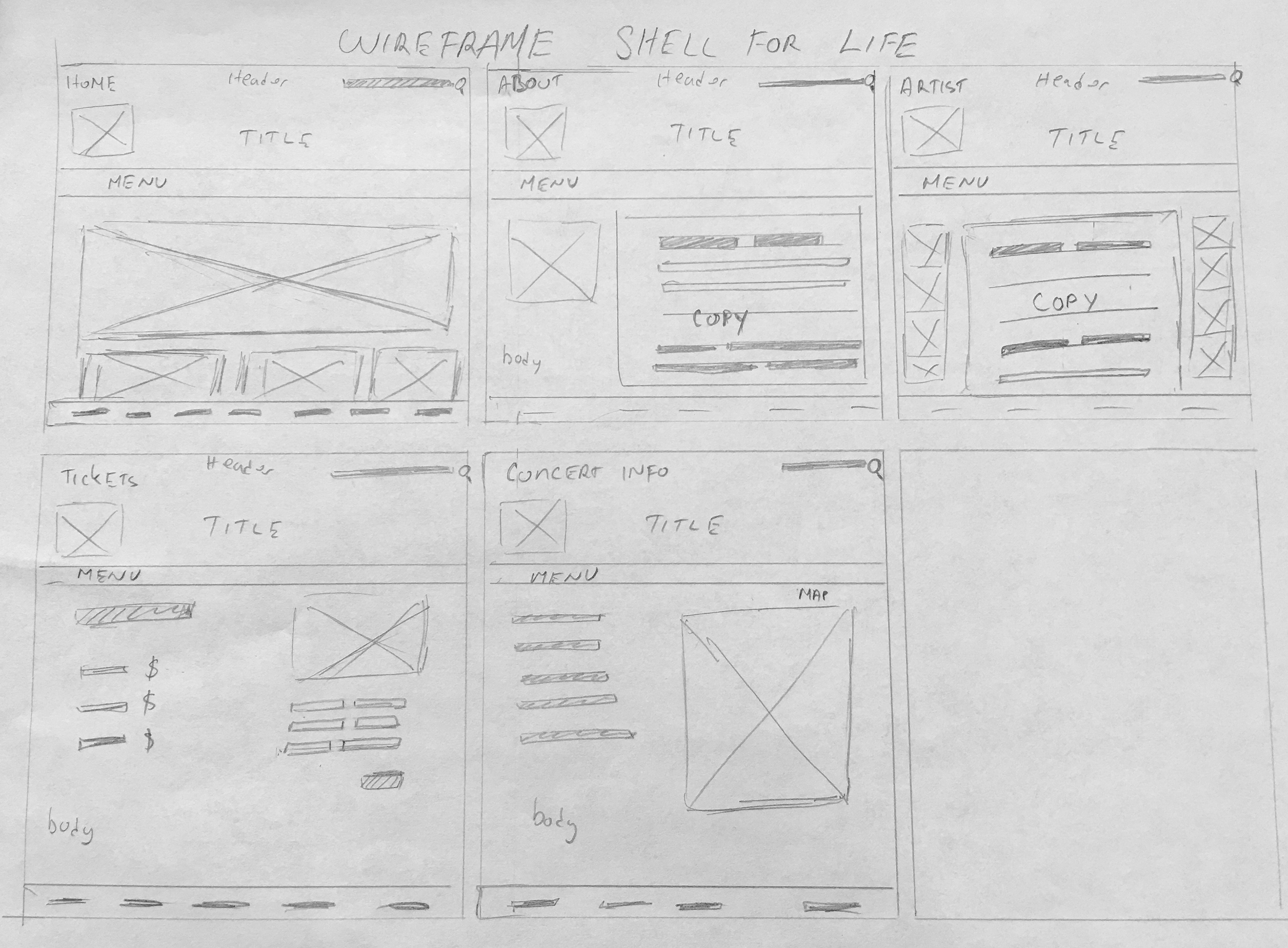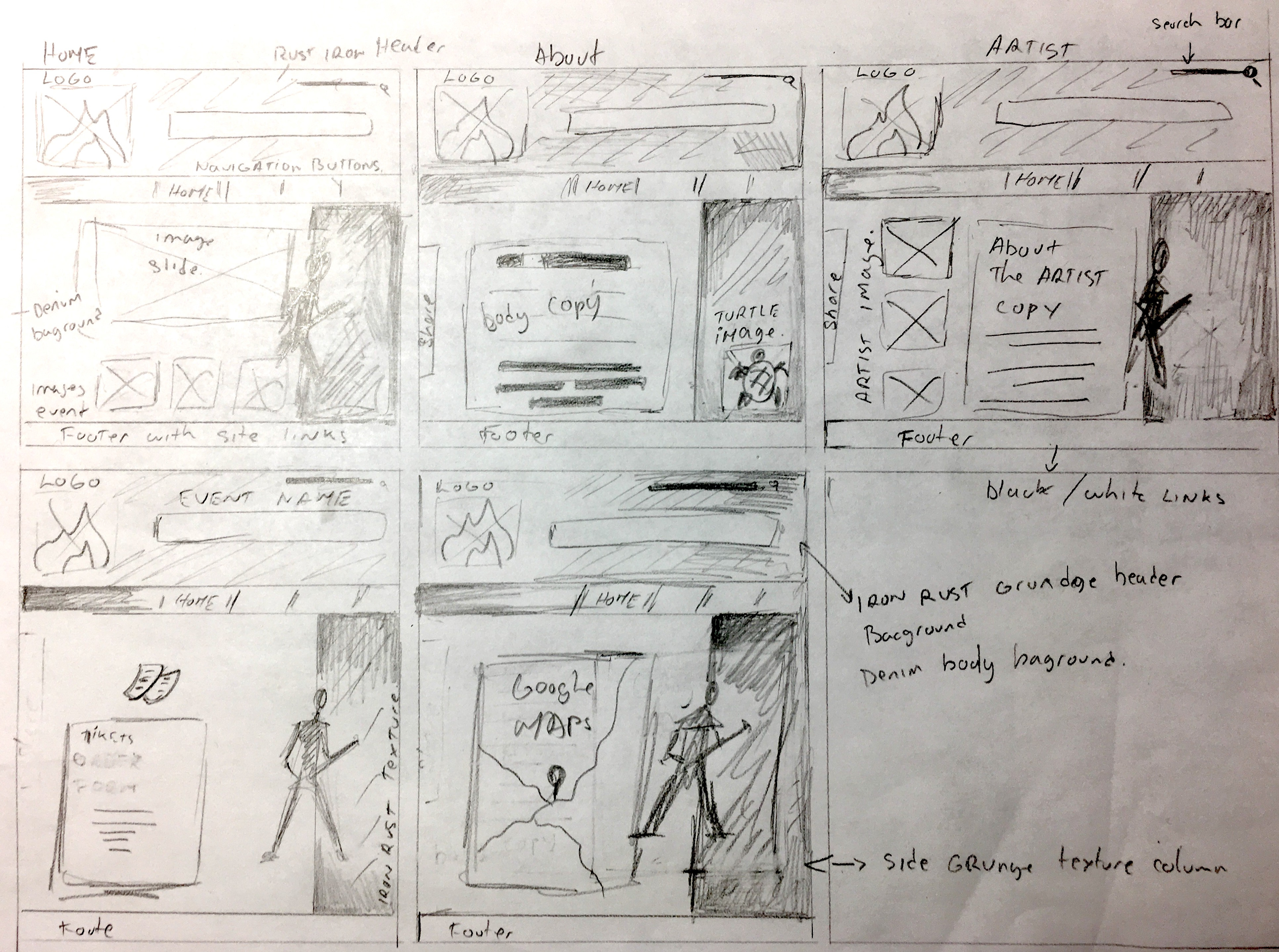 The mood board was created using references of concerts that emphasize energy, much like Vans Warped Tour or Ozzfest festivals that are geared towards a larger targeted audience. Using texture like denim and rust to related to the feel of the music. The use of silhouettes was added to emphasize the mood and feel of the site, and also makes it easy to reproduce the same feeling of the brand throughout promotional material beyond the website.
