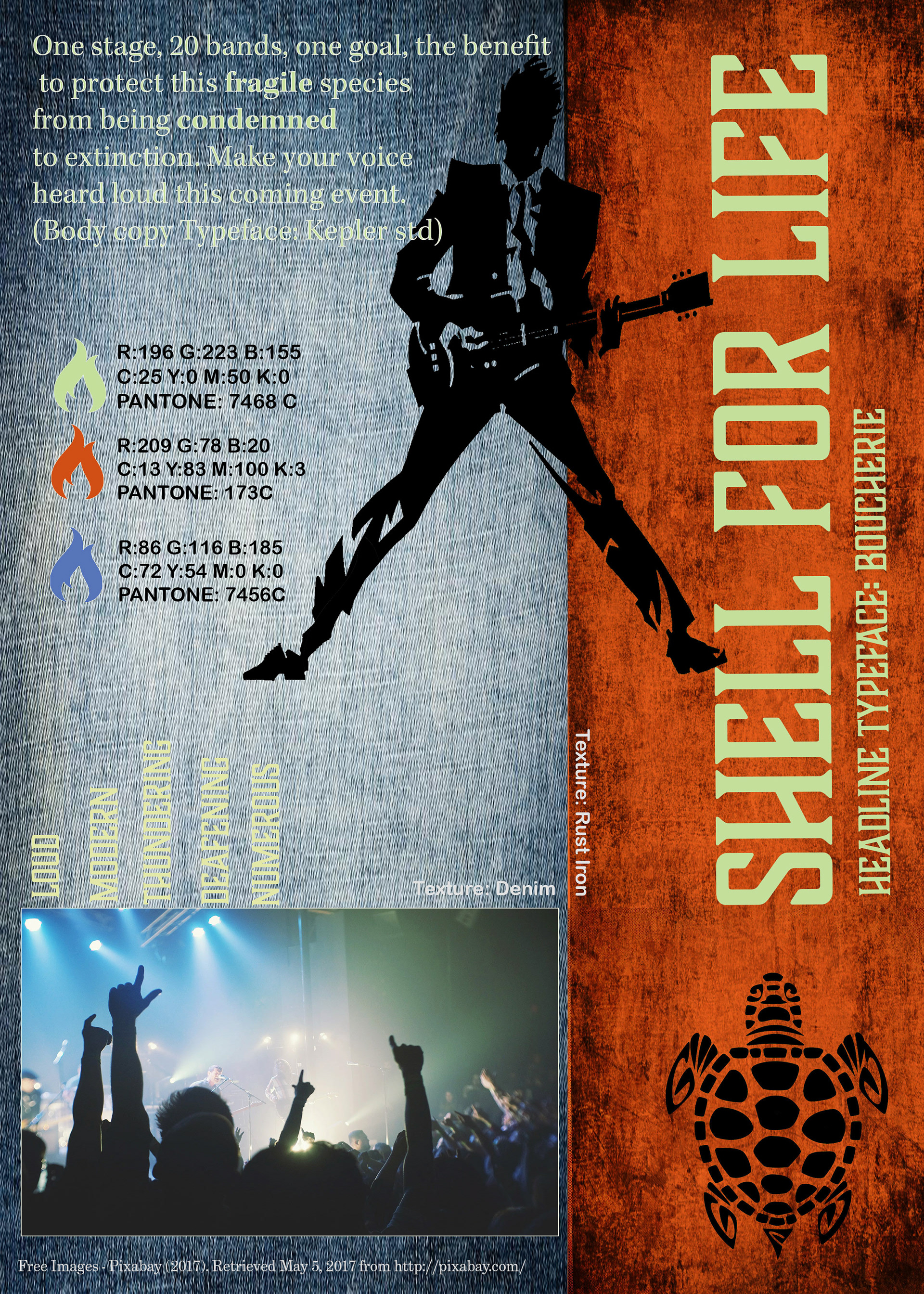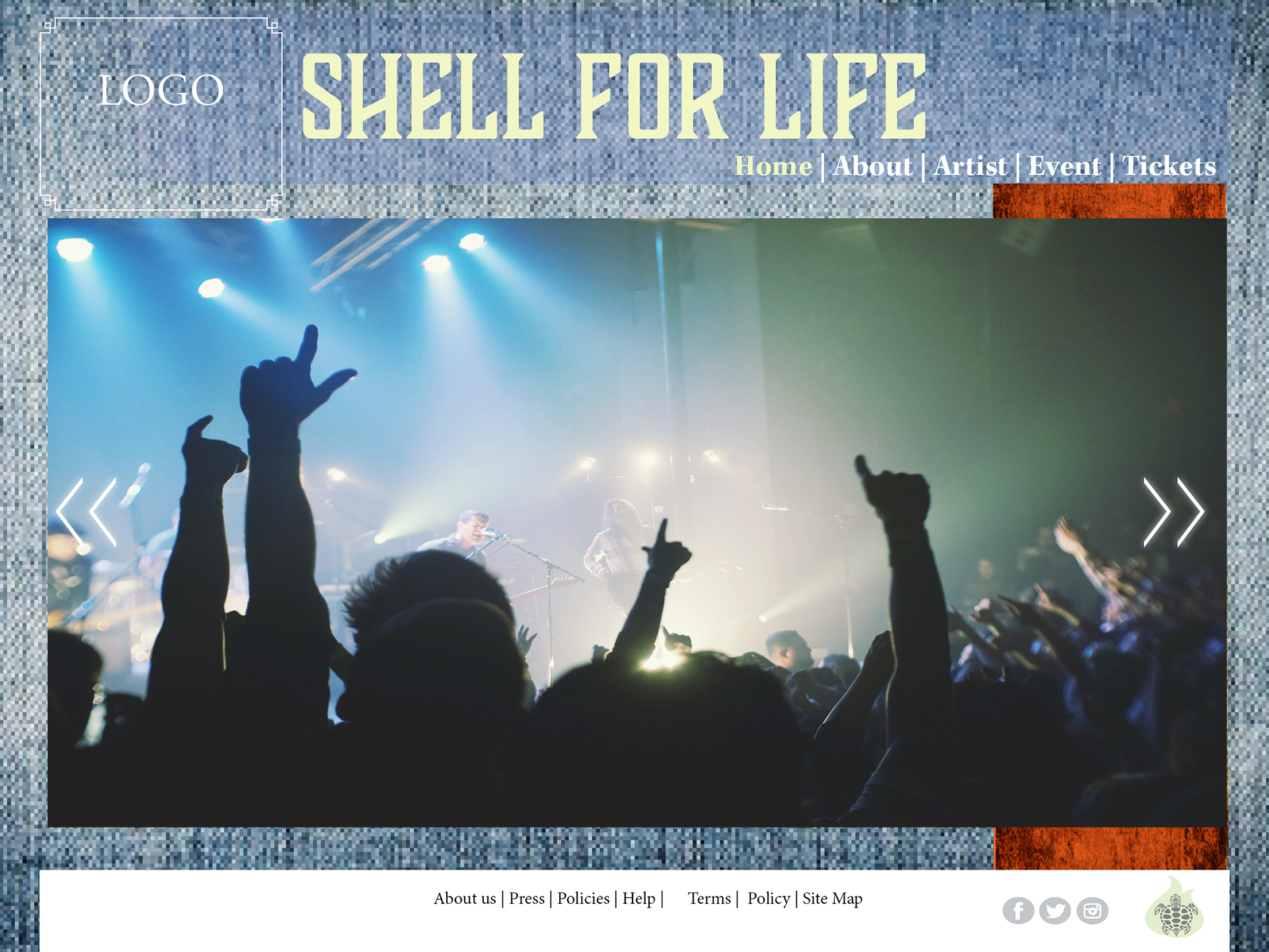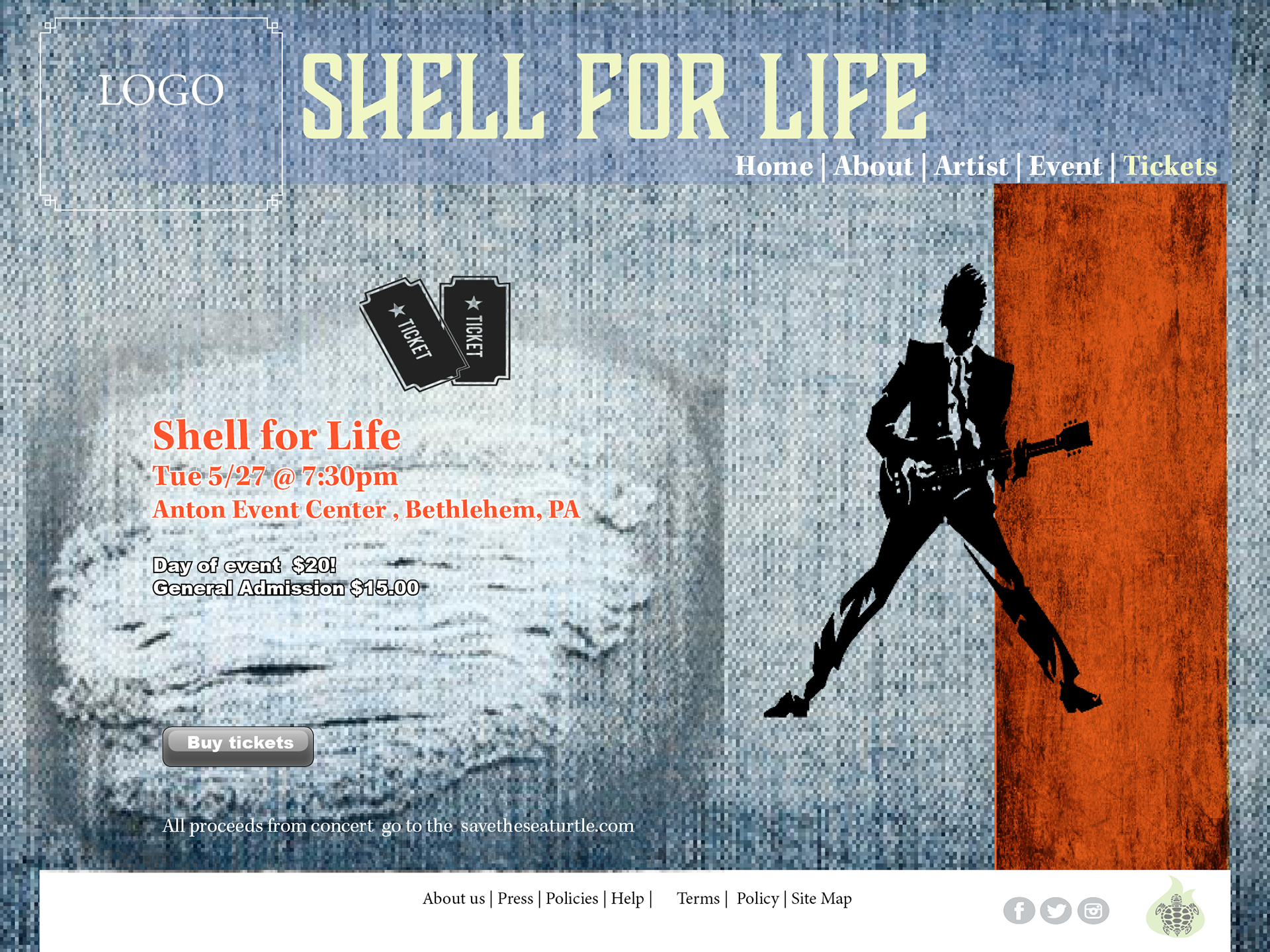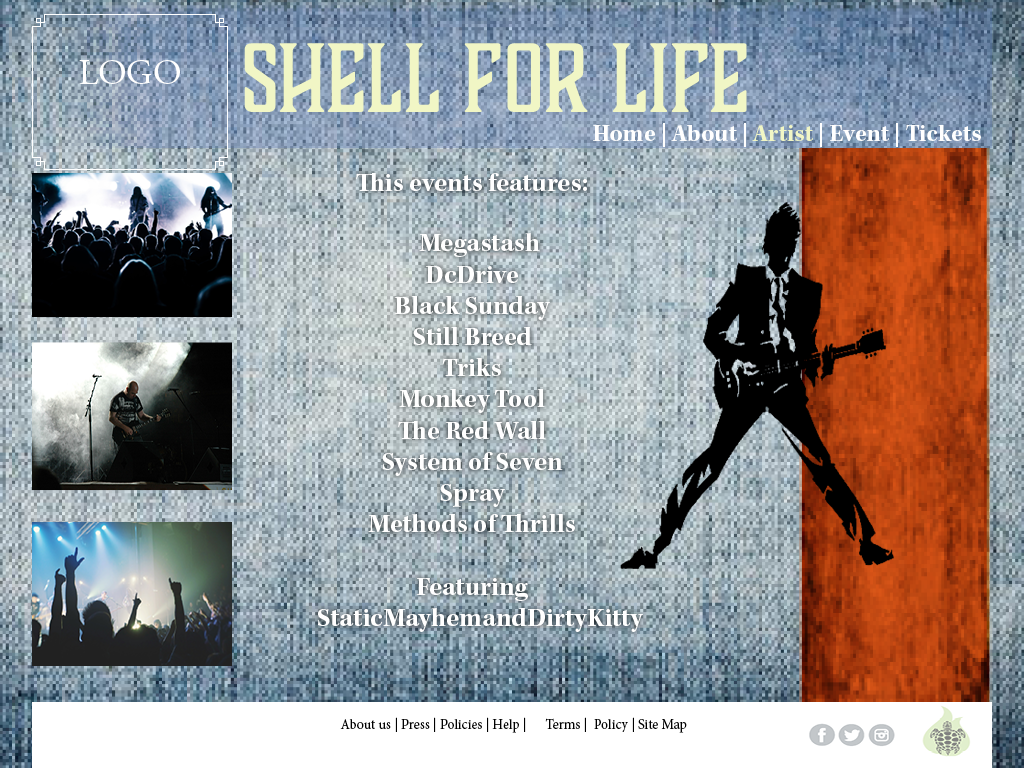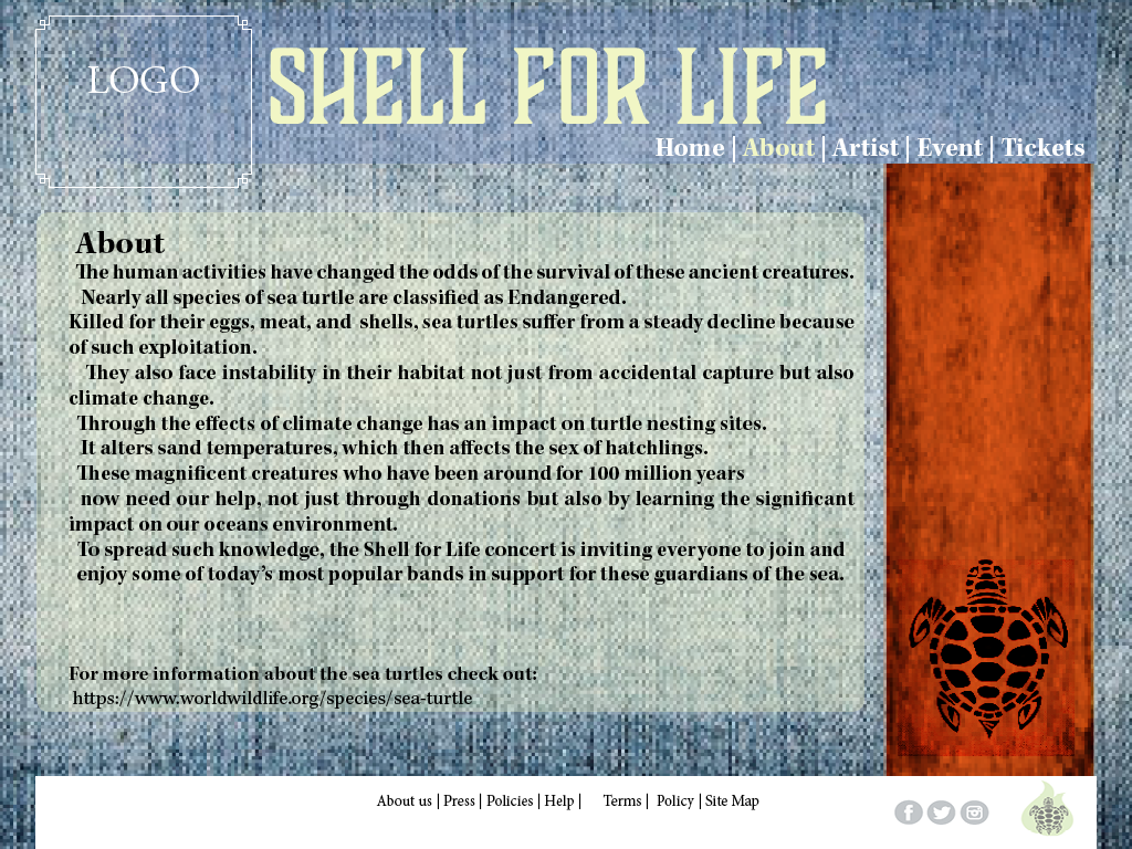 The project that I worked on is a website for a fictional concert, that is meant to bring awareness to save the sea turtles. The theme for the design comps is based on a rock festival that is geared not only towards the younger crowd but also the environmental conscious audience.To entice large crowds to support bands that promote worthy causes, the site is designed to appeal to the music genre and targeted audience.